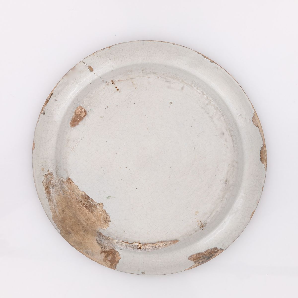 centrato da un ramo a due fiori in verde entro anelli gialli e manganese, circondato da piccolo corelle blu sparse; ghirigori blu completano la descrizione. Sbeccature