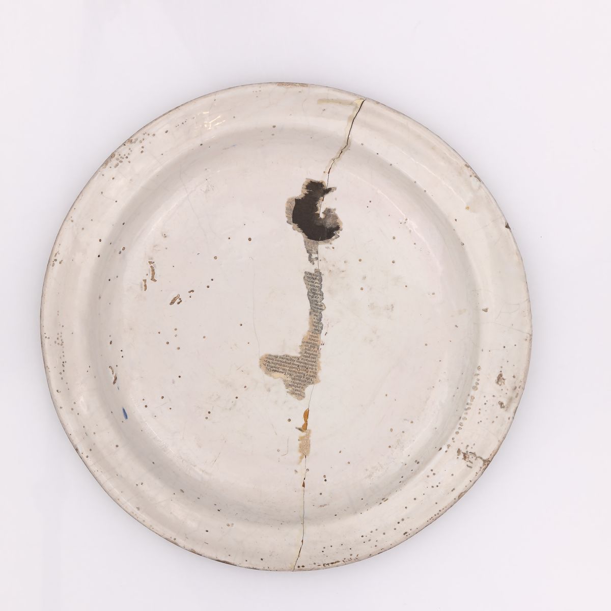 decorato da un uccello giallo, ocra e blu su un ramo verde; ampia bordura ad anelli nei medesimi toni cromatici su cui emergono motivi ondulati continui. Rotture e restauri