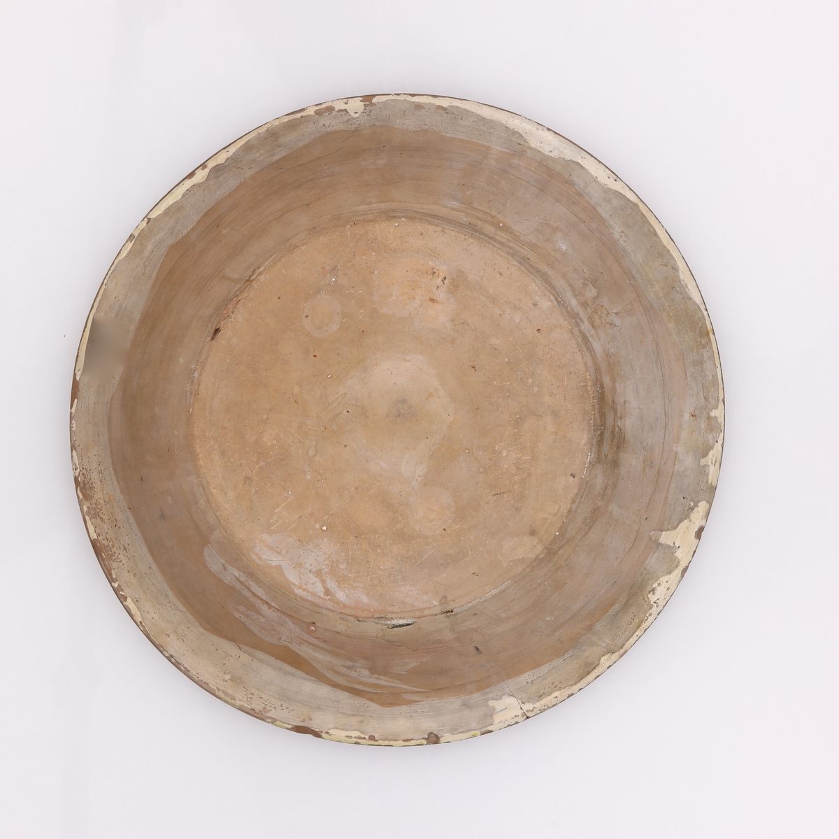 decorato in blu, manganese, verde e giallo, caratterizzato da tre fiori con steli sottili circondati da cornice con foglie e corolle nei medesimi colori; lungo il profilo due ordini di archetti intersecantesi. Alcune cadute di smalto