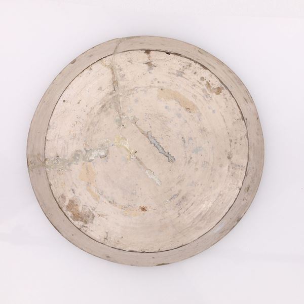 decorato in blu da una figura femminile su zolla delimitata da alberi; lungo la tesa archetti blu, gialli e verdi ad includere rametti manganese. Rotture, restauri e cadute di smalto