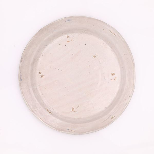 decorato a pennello in rosso, blu, ocra, verde e manganese con un rametto centrale e fiori recisi disposti in sequenza lungo la tesa. Difetti di cottura