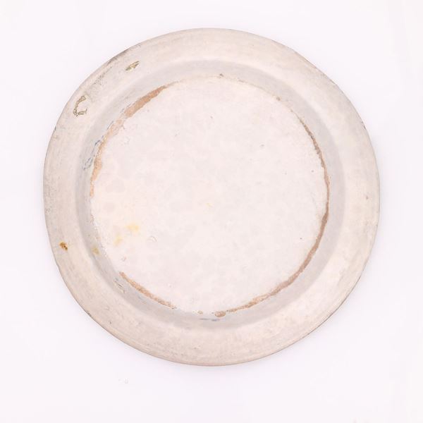 decorato in policromia con chiesetta su zolla caratterizzata da un albero centrale sovrastante la scena; tesa con motivi a esse continui in manganese su fondo giallo e blu