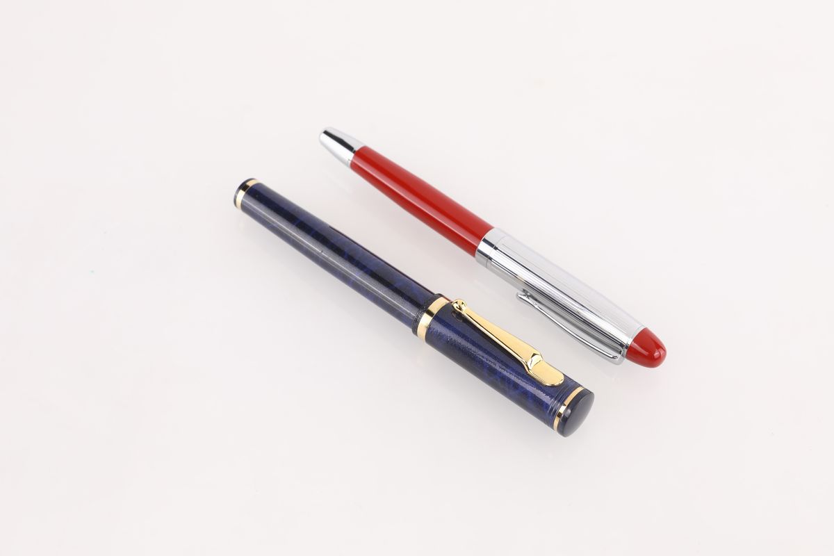 Due penne stilografiche in metallo e vernice, blu e rossa