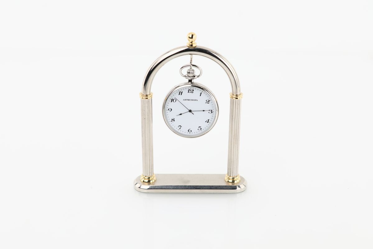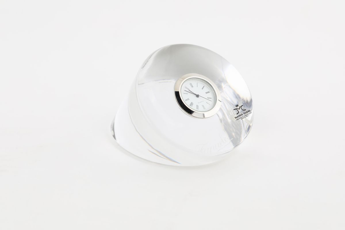 Fermacarte in cristallo con orologio, Mario Cioni per Fanuele, ed orologio da taschino con porta orologio da tavolo