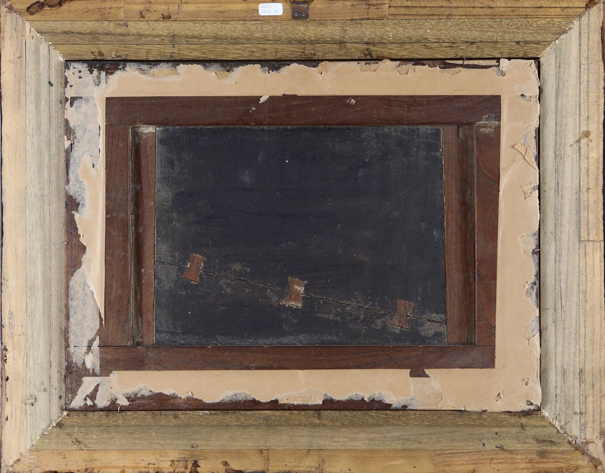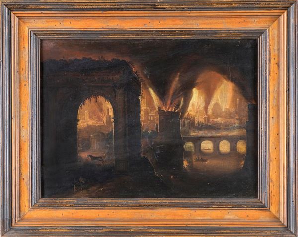 Interessante opera di grande impatto scenico che ripropone l'episodio classico della fuga dell'eroe troiano Enea dalla città in fiamme, come descritta nel secondo canto dell'Eneide. Enea, preceduto dal figlio Ascanio e con il vecchio padre Anchise sulle spalle, compare in basso a sinistra nella composizione, sovrastato dall'apocalittico sfondo della città incendiata. È qui ravvisabile l'influenza di Alessio De Marchis (1694-1752), noto proprio per le sue realistiche rappresentazioni di incendi. La presenza della tavola come supporto suggerirebbe una realizzazione del dipinto non in Italia: in questo caso potrebbe trattarsi di un artista dei Paesi Bassi, tra i tanti che in quegli anni viaggiavano a Roma per il loro apprendistato artistico.