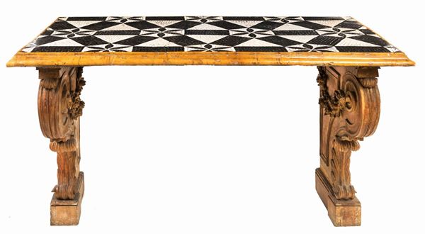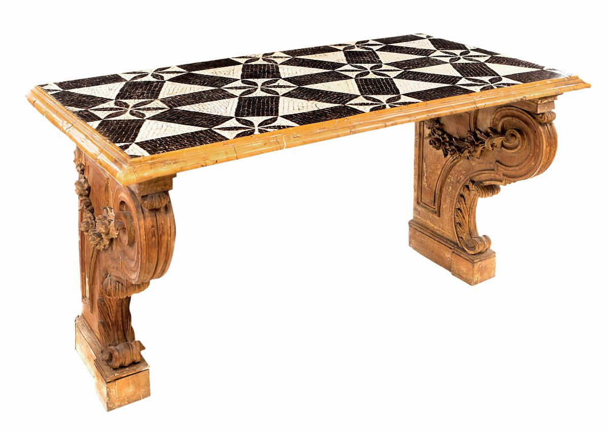 a disegno geometrico a racchiudere corolle ripetute, racchiuso su tre lati da bordura modanata in marmo giallo antico; poggiante su mensoloni in legno scolpito