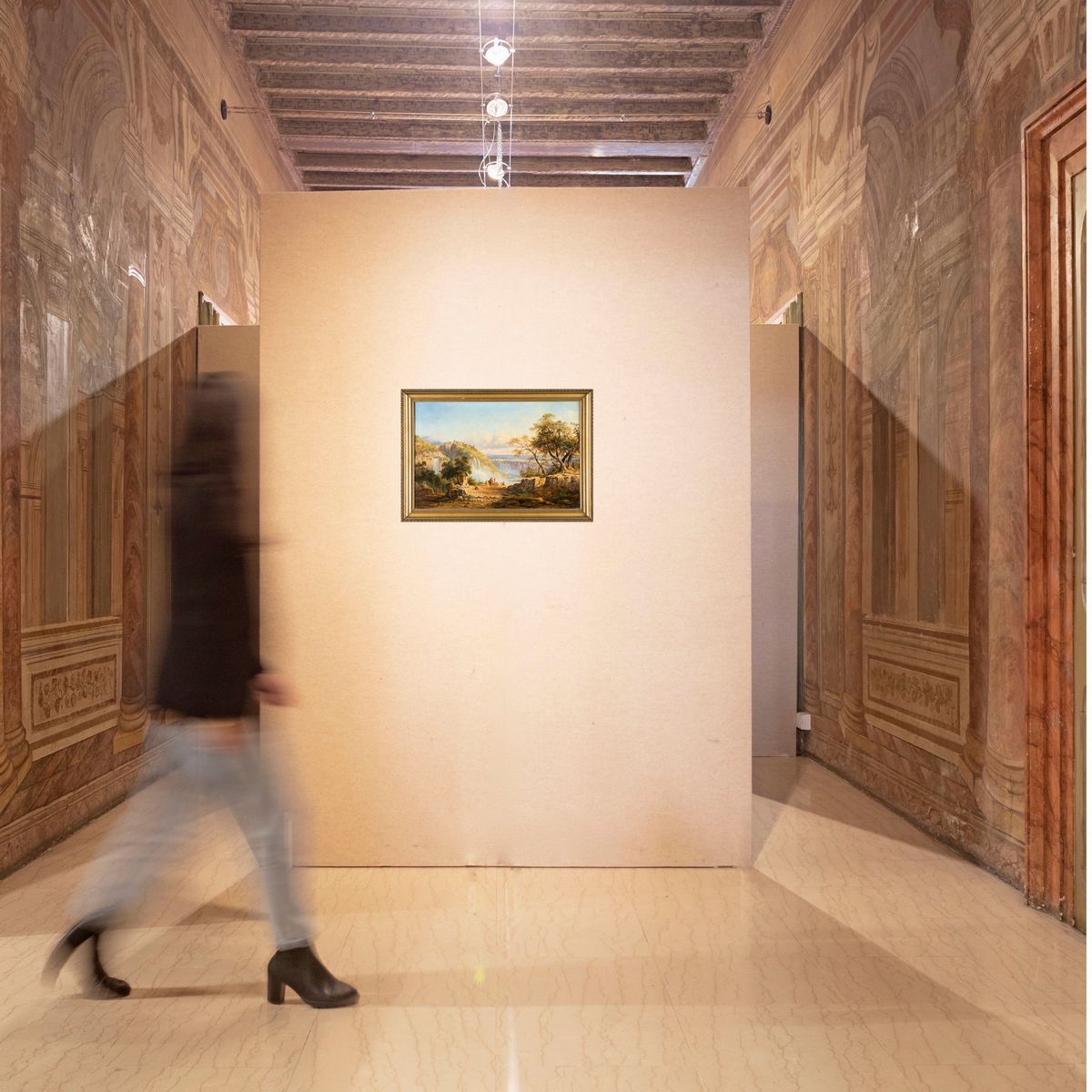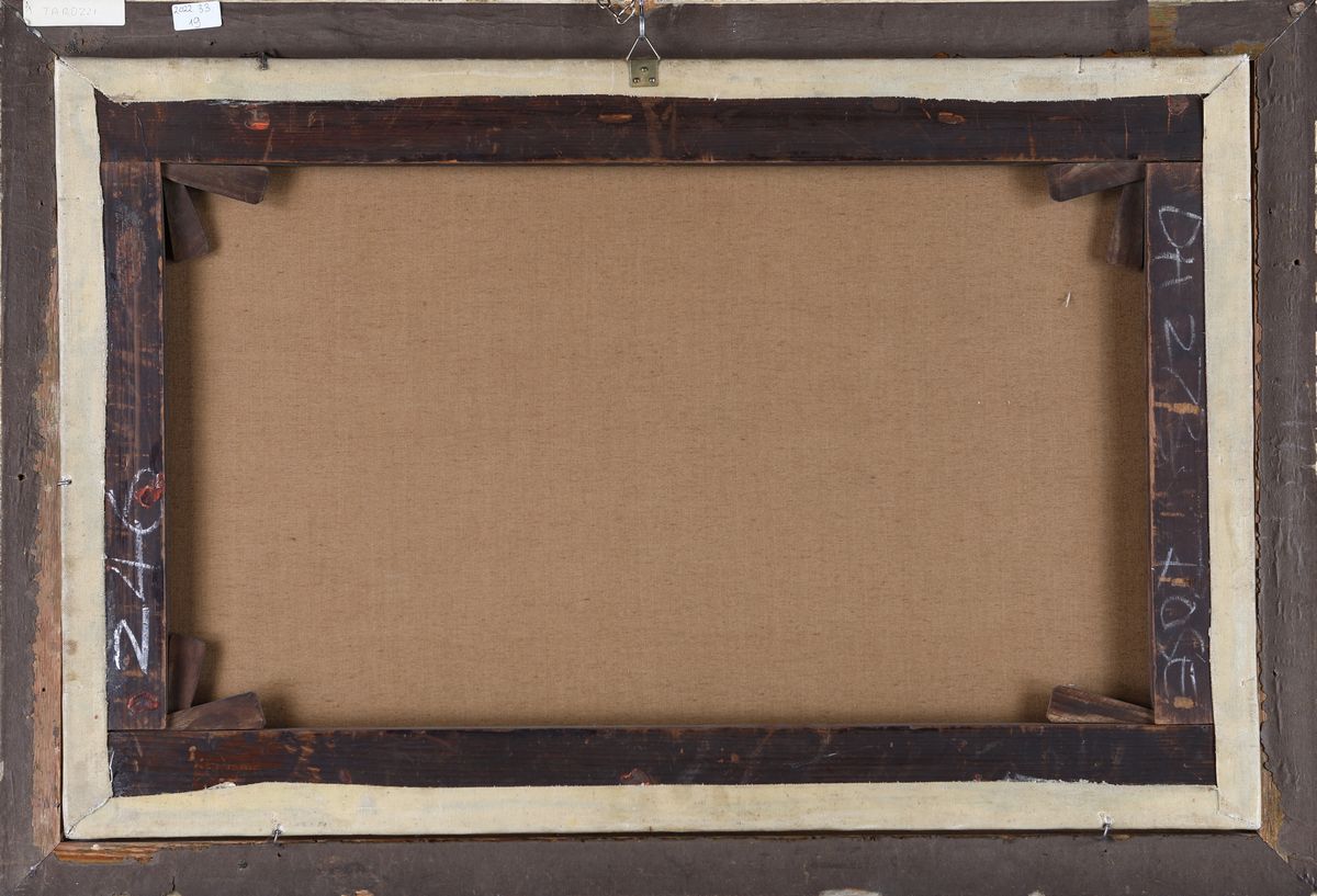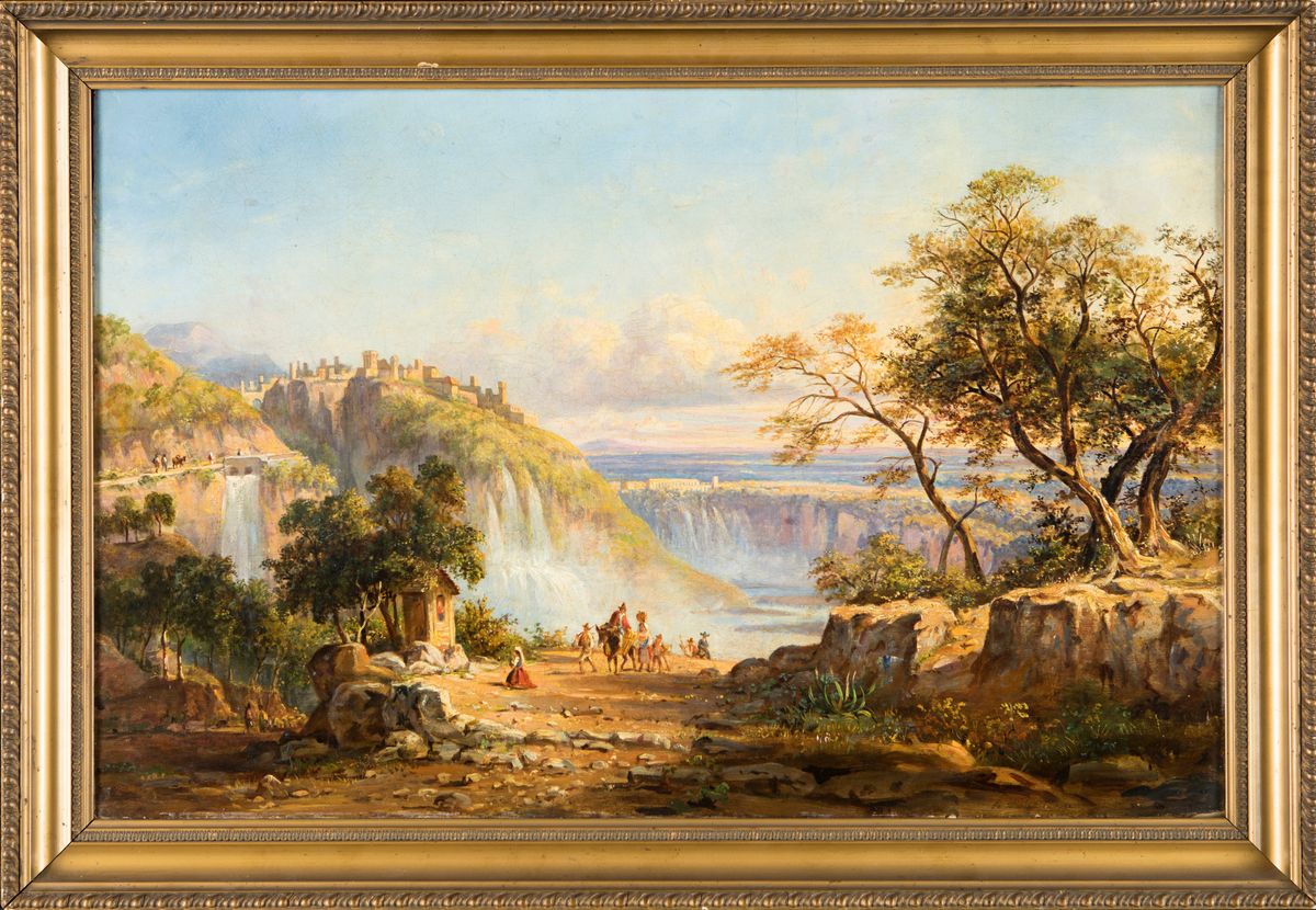 Firmato e datato in basso a destra: A. J. Strutt 1841. Il dipinto, raffigurante un paesaggio con cascate e città sullo sfondo, è opera di un importante paesaggista e archeologo inglese che si stabilì in Italia nel 1831. Strutt passerà alla cronaca per aver intrapreso un viaggio a piedi verso il sud Italia, da Roma a Palermo, le cui osservazioni furono raccolte nel fortunato libro, "A pedestrian tour in Calabria & Sicily" (Un viaggio a piedi in Calabria e in Sicilia), a cui molti paesaggisti si riferirono negli anni successivi. Come vediamo, i colori lucenti e l'equilibrata composizione confermano l'alta qualità dei suoi dipinti