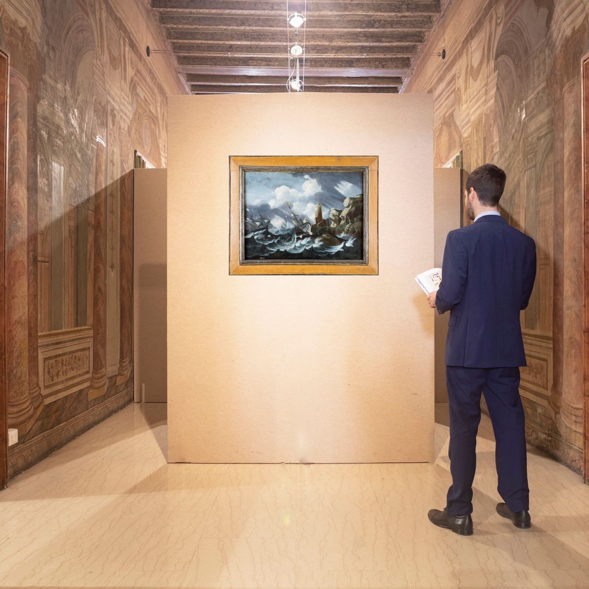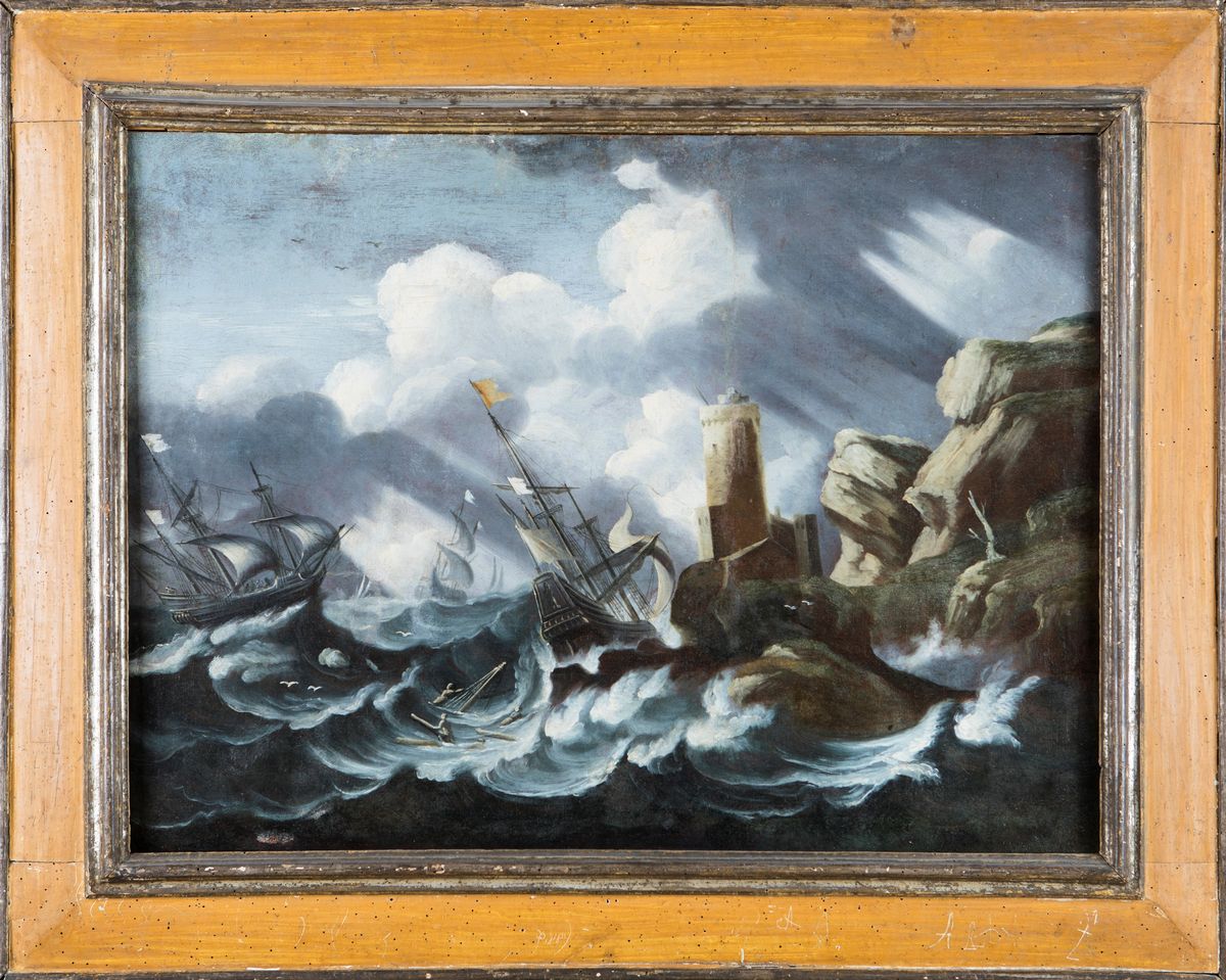 Il tema del mare in tempesta divenne, per numerosi pittori del XVII e XVIII secolo, un espediente formidabile per sperimentare sofisticati virtuosismi pittorici. Bartolomeo Pedon, importante vedutista veneziano, rappresentò in questo senso un modello a cui ispirarsi. La tela qui proposta, con gli efficaci colpi di luce e il grande senso di movimento, si inserisce a giusto titolo tra le produzioni a egli collegabili.