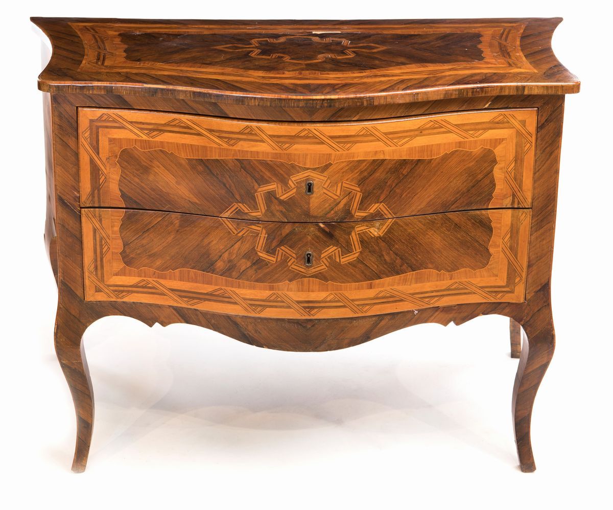 caratterizzato da intarsi in legni di frutto in forma di nastro ad andamento spezzato posto a cornice della varie partizioni e come motivo decorativo centrale di ogni specchiatura; corpo sagomato con due cassetti frontali privi di traversa, gambe mosse