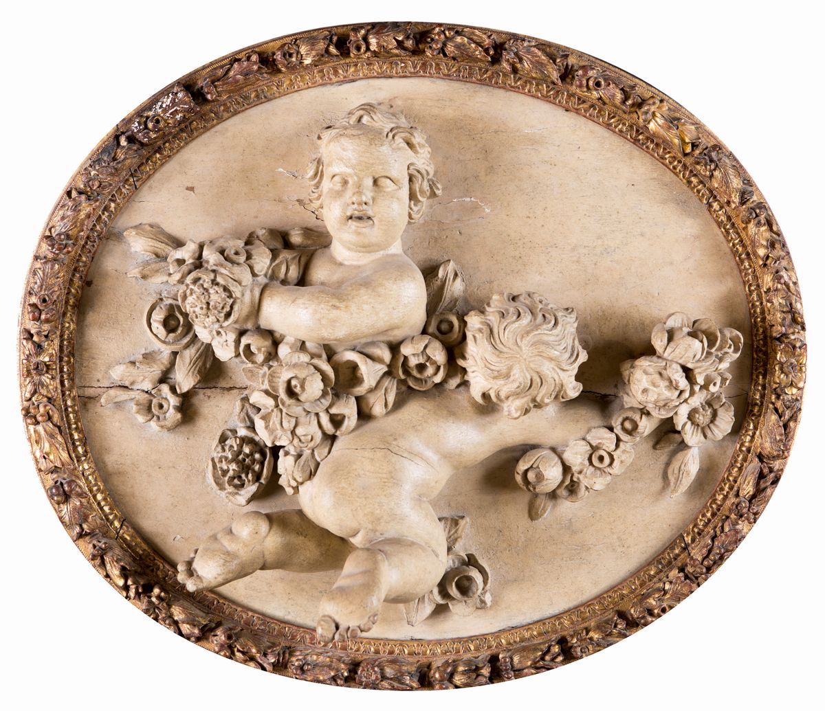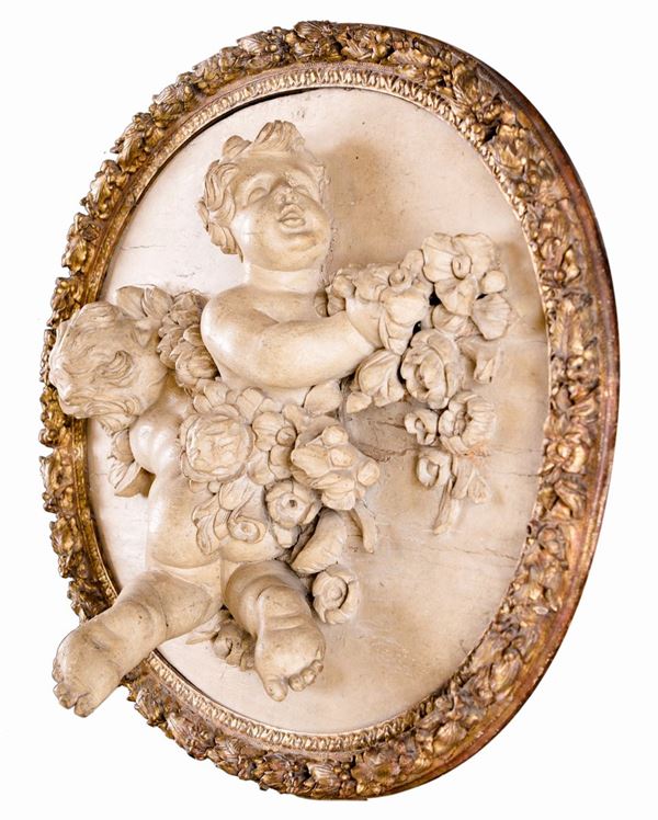 caratterizzati da figure di amorino racchiuse da profilo in forma di cornice intagliata e dorata percorsa da ghirlanda fiorita