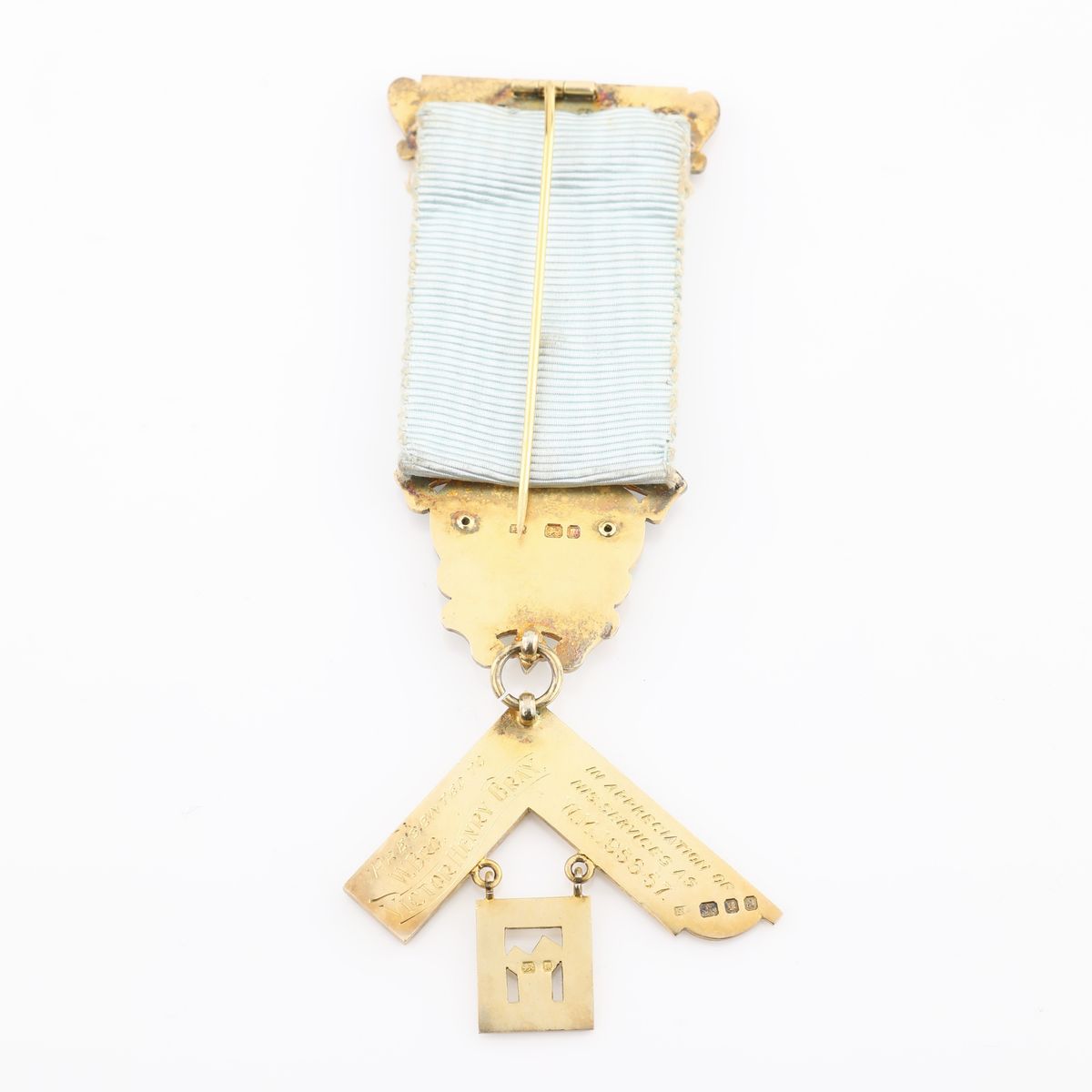 con miniatura in smalti policromi e squadra pendente con teorema di Pitagora; cartiglio in smalto all'apice del nastro con iscritto "nonus"; inciso al verso: Presented to W.Bro. Victor Henry Bray in appreciation of his services as W.M. 1956-57. Bollo della città di Londra con datario 1956-57 e dell'argentiere E.P.
