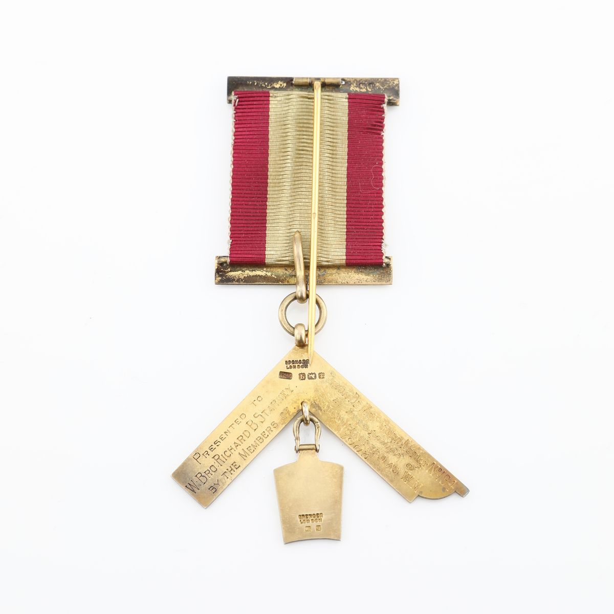 con squadra e pendente con triangolo e simboli; inciso al verso: Presented to W.Bro. Richard B. Starney by the members of Simon De Montford Lodge n° 194 in recognition of Services rendered as W.M. 1903. Bollo della città di Birmingham e dell'orafo Spencer di Londra
