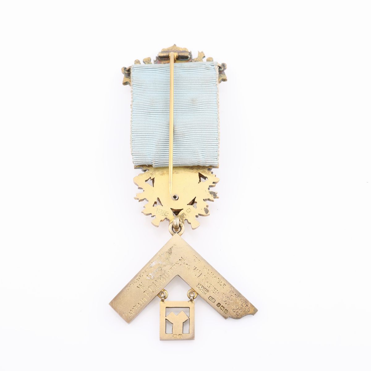 caratterizzato dal motto "on y soit qui mal y pense" e pendente in forma di squadra con teorema di Pitagora; inciso al verso: Presented to W. Bro. Captain F.C.R. Britten for valuable services as W.D.Master 1927-28. Bollo della città di Birmingham con datario 1927-28 e dell'argentiere Spencer di Londra