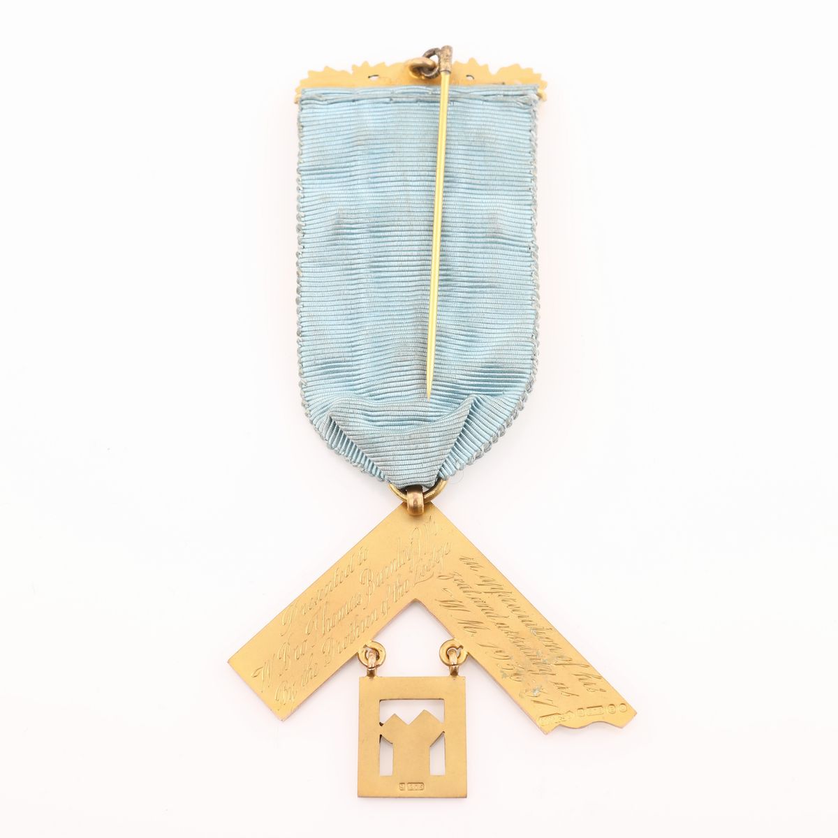 a forma di squadra con tabella pendente contenente teorema di Pitagora; sulla coccarda miniatura smaltata di Santa Barbara. Inciso al verso: Presented to W. Bro. Thomas Burnley P.M. by the Brethren of the Lodge in appreciation of his zeal and assiduity as W.M. 1936-37. Bolli della città di Londra con datario 1937 e dell'argentiere C.W. & sons