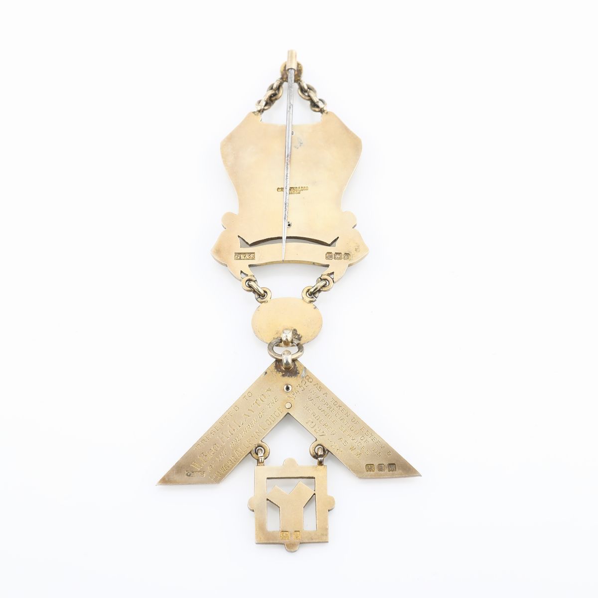 in forma di cartiglio con indicato "6th wor master", stemma in risalto e motto "detur gloria soli deo". Inciso al verso del pendente in forma di squadra con capitello e teorema di Pitagora: Presented to W.Bro. H.J. Layton by the brethren of the Edward Alleyn Lodge n° 4328 as a token of esteem & in appreciation of his valuable services rendered as W.M. 1927-28. Bolli della città di Birmingham con datario 1927-28 e della città di Londra con analogo datario e dell'argentiere C. Kennings and son London