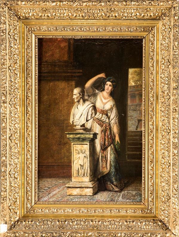 Una figura di donna, personalizzazione della gloria, disvela il busto di Cesare tenendo in mano una corona di alloro. Il dipinto, con la sua enigmatica iconografia, fa parte di un filone che ebbe molto successo durane il XIX secolo, legato alla rappresentazione di allegorie e temi storici interpretati in modo più o meno fantasioso. Questo tipo di pittura si caratterizza per i numerosi riferimenti alla classicità, che spesso facevano eco alle importanti scoperte in campo archeologico di quegli anni. Possiamo in questo caso notare l'attenzione riposta nella raffigurazione di un pavimento intarsiato, i riferimenti alla statuaria, e alcune architetture sullo sfondo che ricordano i luoghi pompeiani.