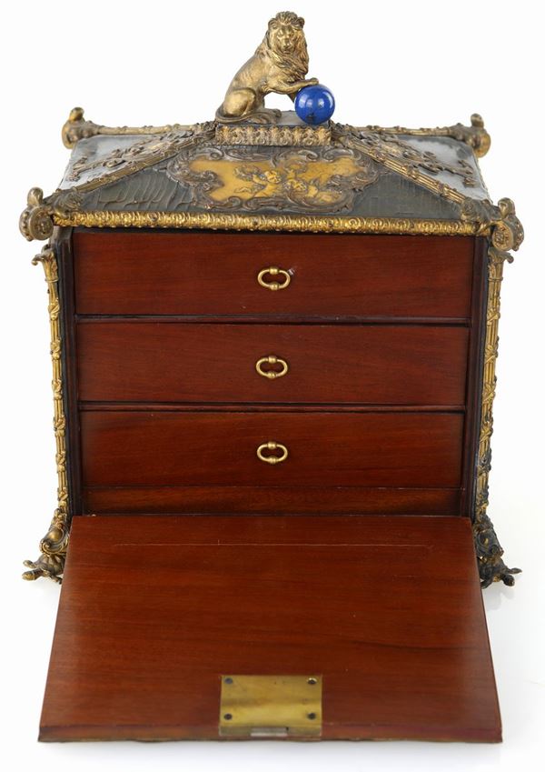 con struttura squadrata e copertura ad urna dominata da un leone, con facciate decorate da applicazioni in bronzo dorato in forma di volute vegetali a creare un reticolato su cui idealmente siedono figure di amorino; poggiante su figure di tartaruga, reca tre tiretti interni. Difetti alla lacca