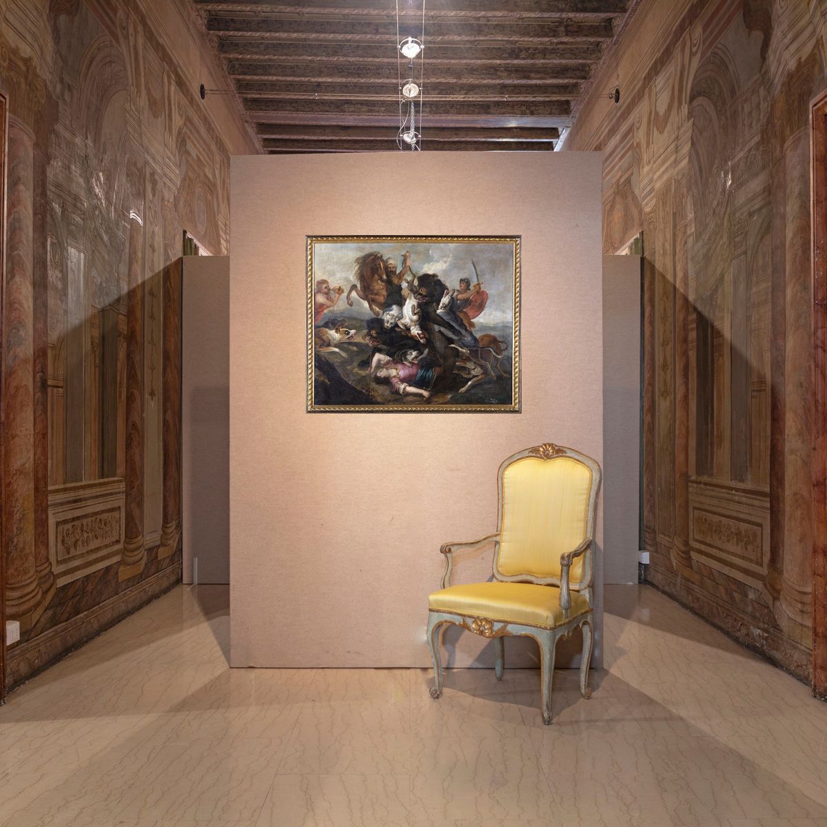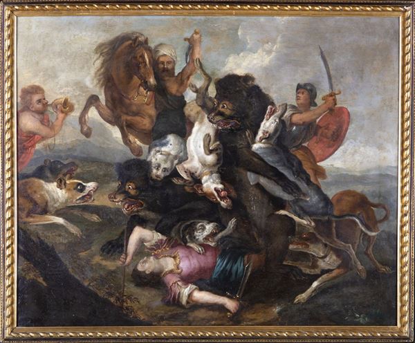 Il grande dipinto su rame qui proposto, di cui ammiriamo l'abilità nella costruzione di una complessa architettura compositiva e nella accentuata espressività degli animali, si riferisce alla mano di un artista fiammingo operante nella seconda metà del Seicento. Il genere dei combattimenti tra animali, o tra animali e uomini come in questo caso, ebbe un certo successo nel XVII e XVIII secolo, e si collega soprattutto alle turbolente e vorticose composizioni di Pieter Paul Rubens, che dovettero fare una enorme impressione su intere generazioni di pittori e che erano, a loro volta, il frutto delle meditazioni del pittore fiammingo sulla produzione di Leonardo Da Vinci (si veda, ad esempio, il caso celebre della sua copia di un parte della perduta Battaglia di Anghiari per il Salone dei Cinquecento a Palazzo Vecchio, Firenze.).