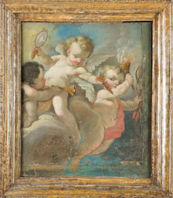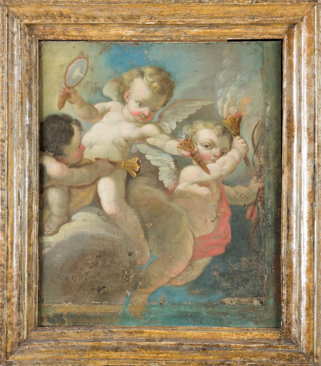 Tre putti accendono delle torce usando il calore della luce del sole e una lente di ingrandimento. La compiaciuta e divertita espressività delle figure, i colori brillanti e la morbidezza dei toni rimandano alla pittura francese.