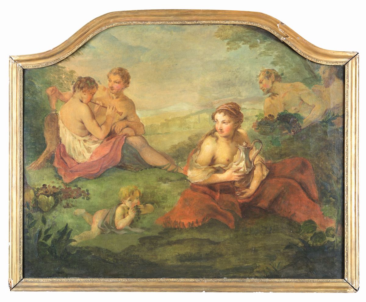 Pregevole sovraporta decorata con scena bucolica a soggetto mitologico con ninfe e satiri che si dilettano. Il carattere orgiastico e scandaloso legato all'iconografia del baccanale, sebbene in questo tipo di produzioni depotenziato e declinato in chiave bucolica, è suggerito dalla presenza dei satiri in atteggiamenti lascivi e dalla presenza del vino. In questo caso ci colpisce particolarmente la piacevole freschezza della scena.