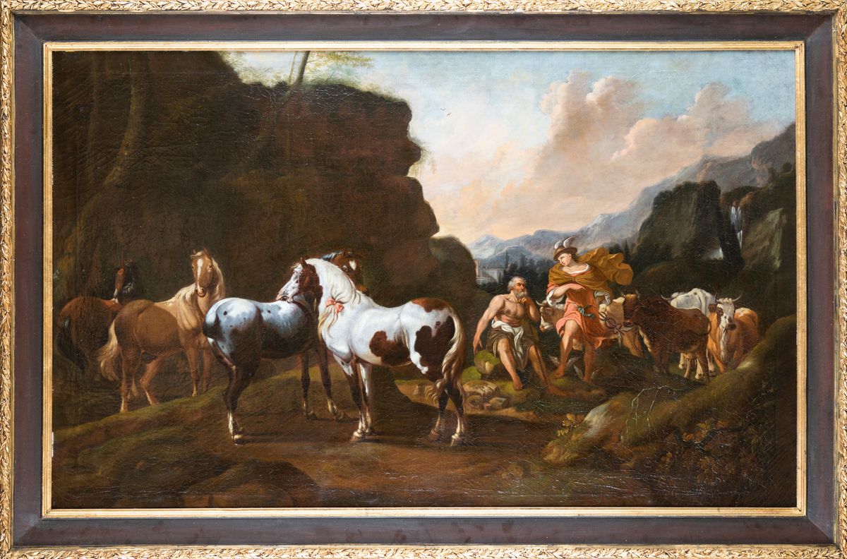Il dipinto raffigura l'episodio mitologico del furto delle giovenche di Apollo da parte di Ermes. Quest'ultimo, dopo aver comprato il suo silenzio, porta gli animali rubati sul monte Menalo, sotto la supervisione del pastore Batto, che successivamente subirà l'ira di Ermes per essere venuto meno ai patti stabiliti. L'episodio diventa qui un espediente per eseguire una piacevole rappresentazione del paesaggio montano, mentre le figure, non prive di una certa ironia, sono ancora seicentesche nella pennellata