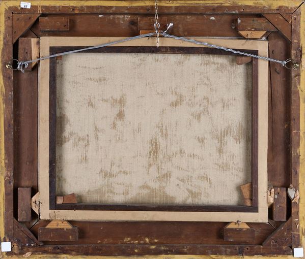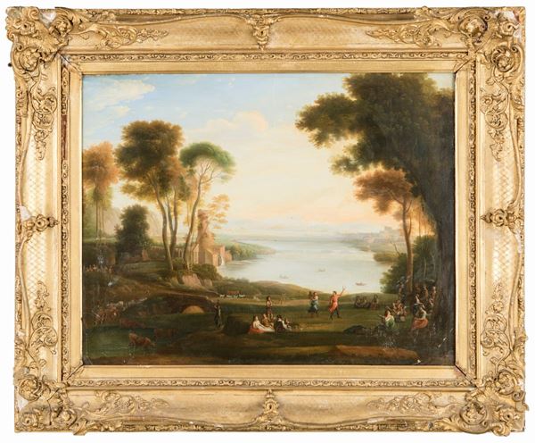 Arioso paesaggio secondo l'impostazione classicista. La natura idealizzata e le piccole figure che la abitano rimandano alla lezione di Claude Lorrain, ancora estremamente viva nella prima metà del XVIII secolo.