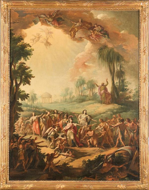 La tela rappresenta una complessa allegoria che fa probabilmente riferimento al tema del rinnovamento apportato dal cristianesimo sul paganesimo. L'architettura compositiva, il perfetto equilibrio cromatico e la grande qualità rimandano a un pittore attivo a Roma che certamente ebbe modo di rielaborare la lezione cortonesca, e in generale quella del glorioso barocco romano, restituendola attraverso una volontà di ordine compositivo già settecentesco.