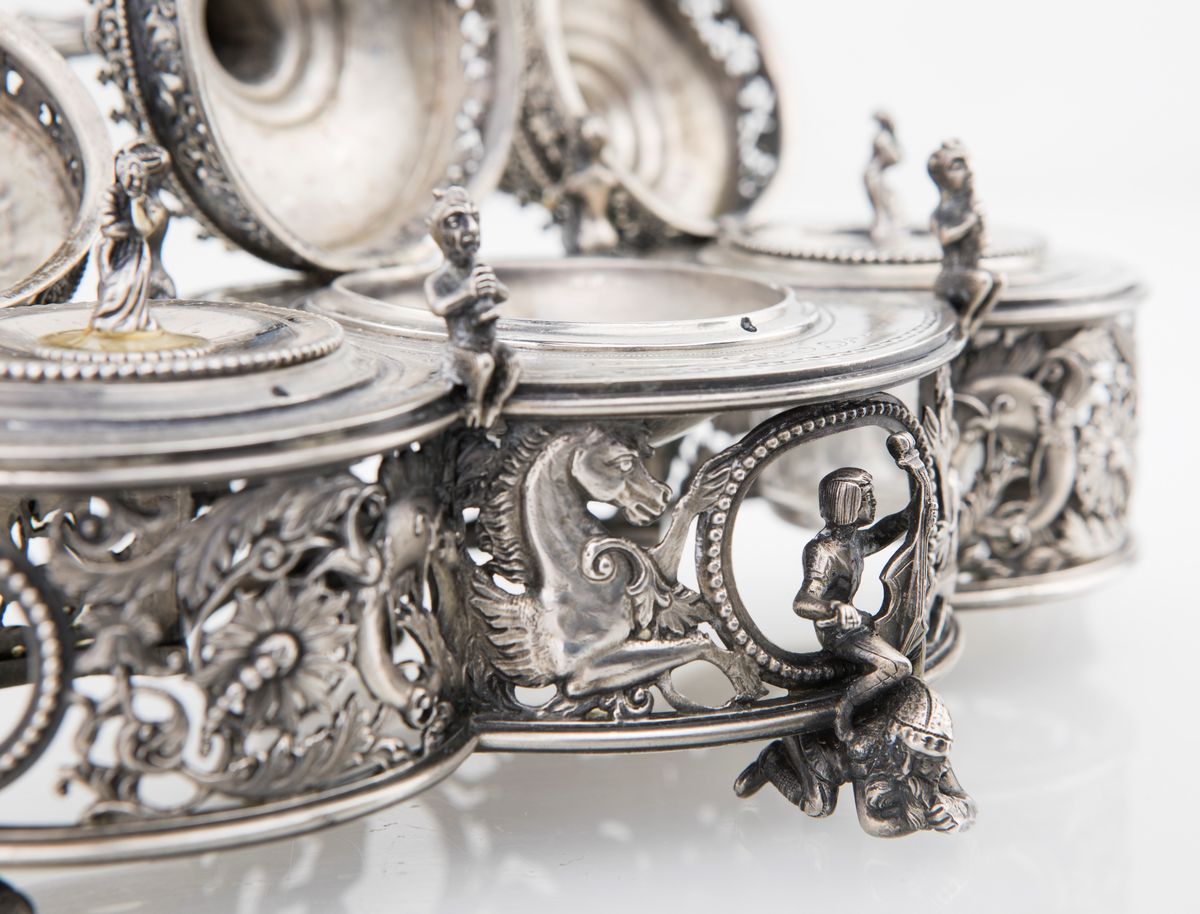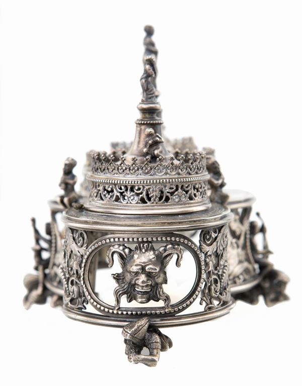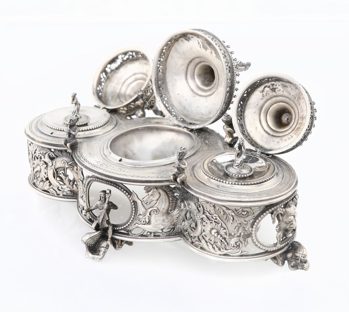 con struttura trilobata traforata caratterizzata da fitta composizione naturalistica in cui spiccano figure di ippocampo; quattro aperture ovali racchiuse da perlinatura fungono da cornice ai sostegni scultorei in forma di figure prone cavalcate da musici; sulla sommità tre contenitori definiti da ringhierina traforata, con coperchi a pinnacolo affiancato e dominato da figure. Un vasetto in vetro porta inchiostro mancante