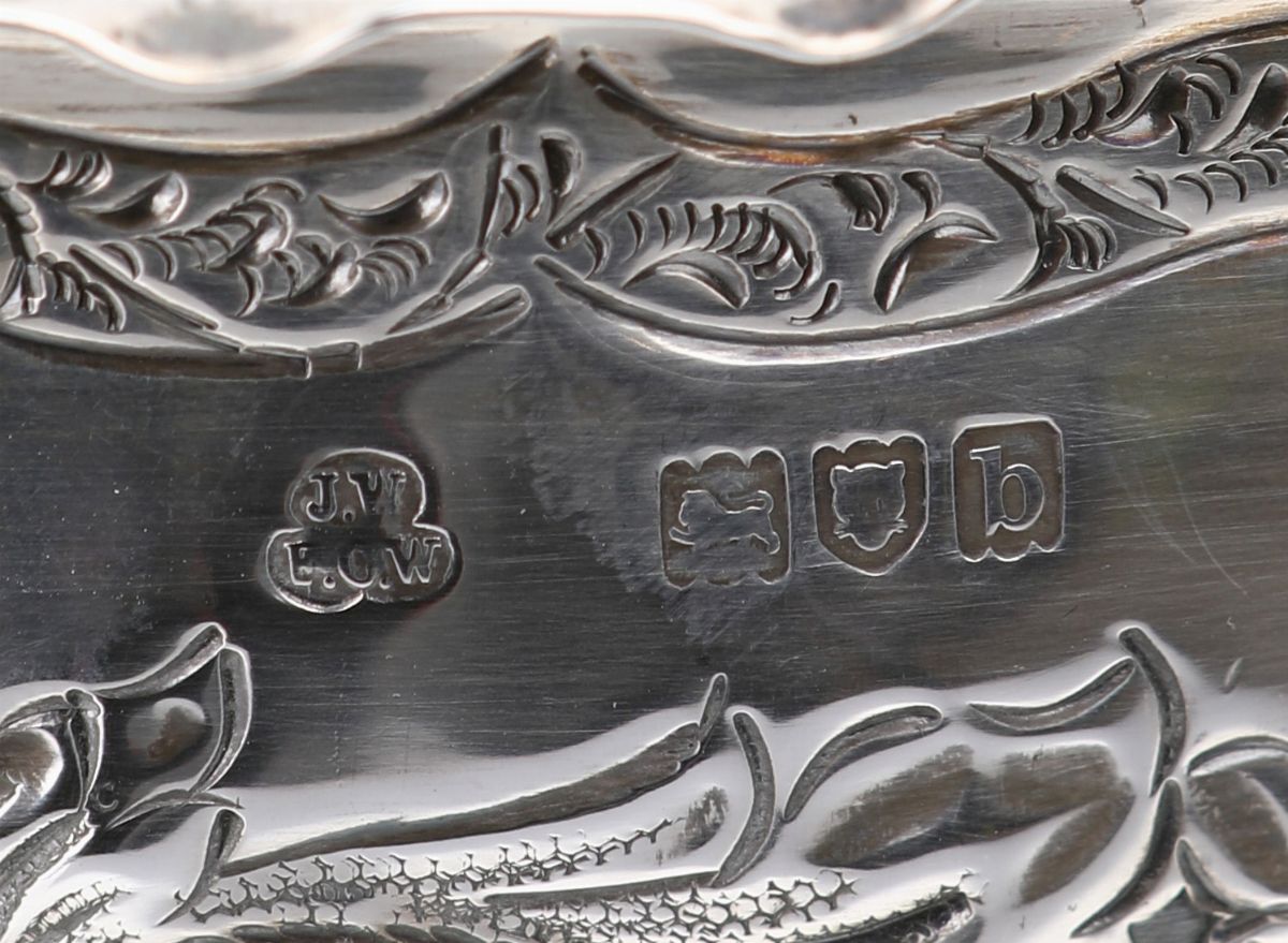 decorata con fiori e cartigli incisi e sbalzati; orlo ondulato, piede circolare