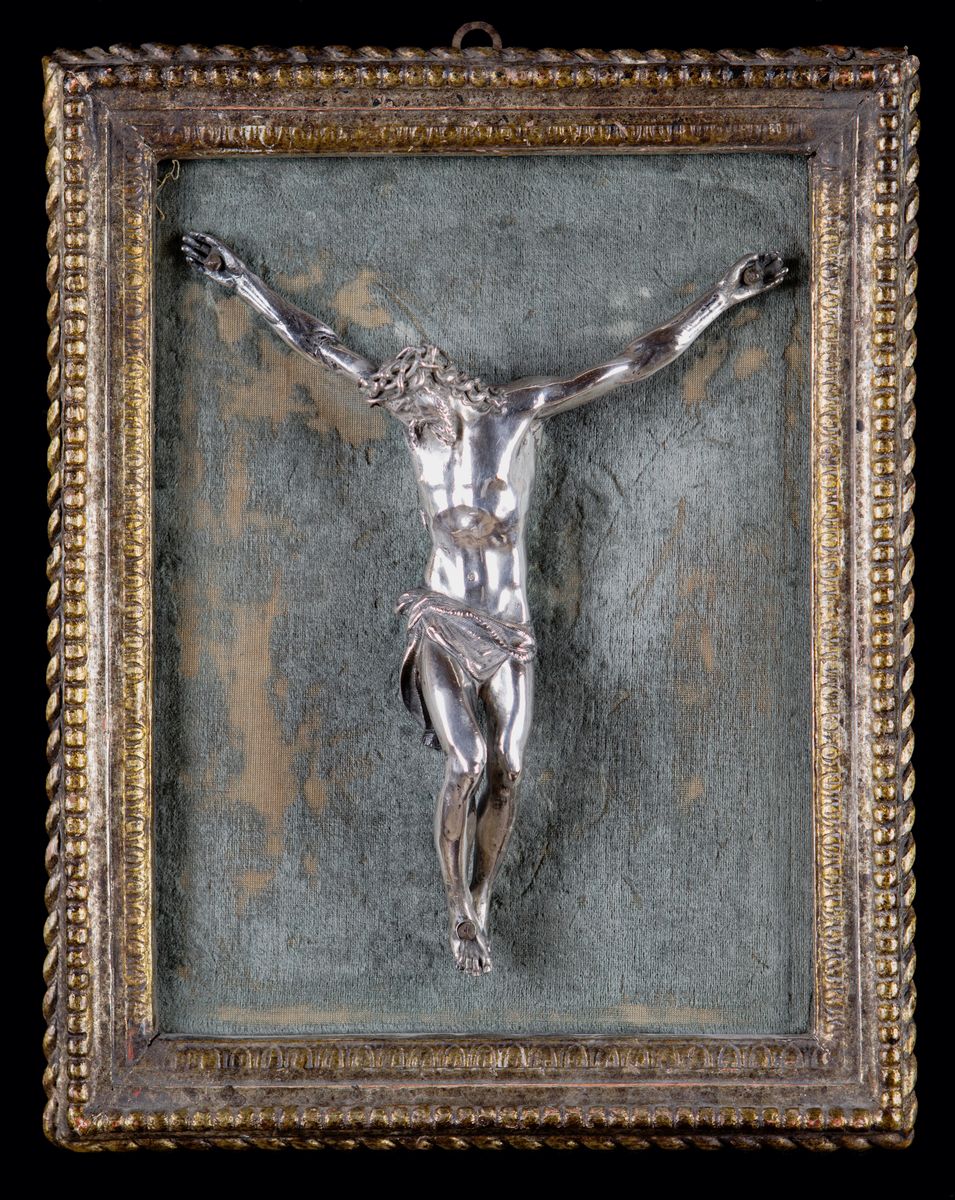 applicato su tavola rivestita in velluto entro cornice in legno intagliato e dorato