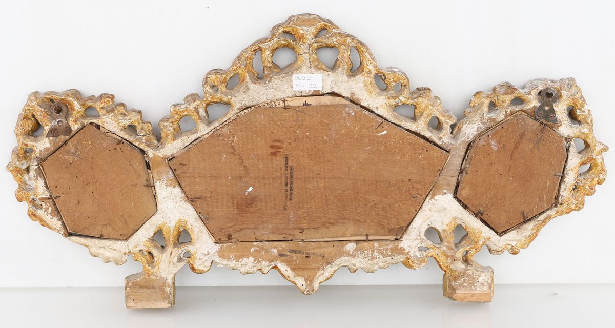 a tre cartelle unite di forma sagomata contenenti specchi, sorrette da piedi squadrati