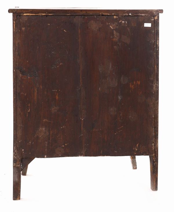 di forma sagomata con filettature e intarsi a stella posti al centro del piano, dei fianchi e dei tre cassetti frontali; restauri e rifacimenti