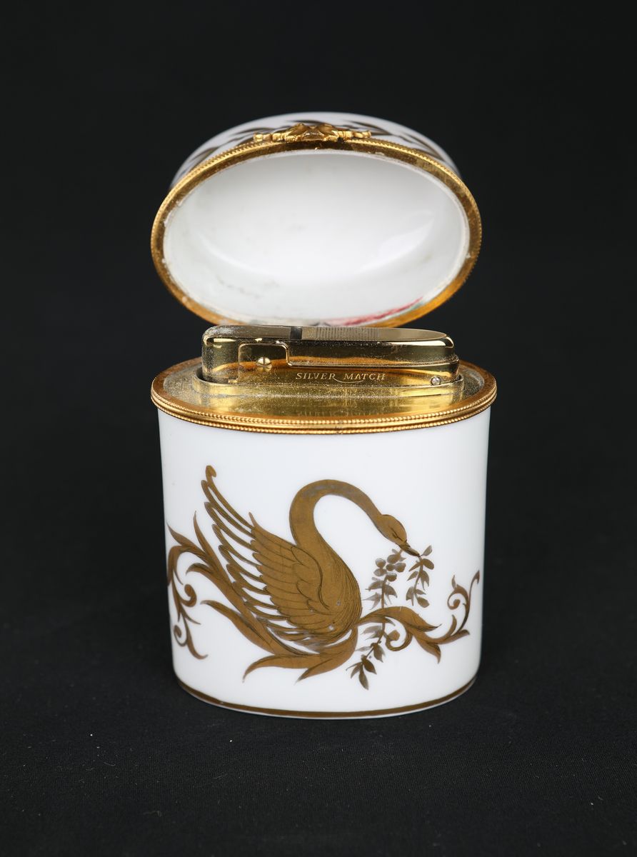 composto da un calamaio, due contenitori di diversa misura con coperchio incernierato, una scatola a forma di libro ed un accendino; ogni elemento è decorato a mano con figure di insetto, volatile e motivi vegetali. Unito ad un penna a sfera in metallo dorato