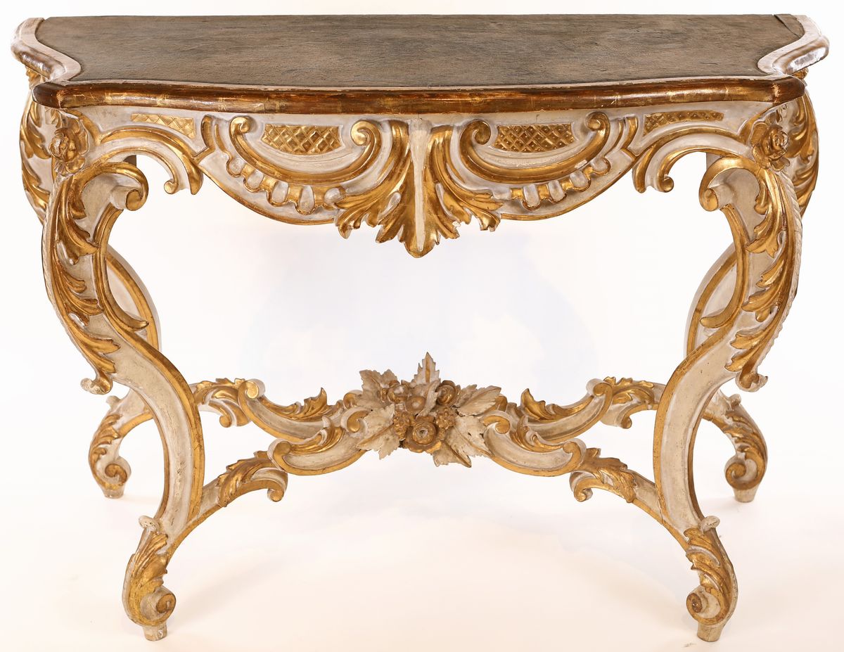 di forma sagomata con gambe mosse sottolineate da rilievi vegetali, riunite da traversa a crociera sormontata da trionfo di fiori; piano incassato rivestito in velluto