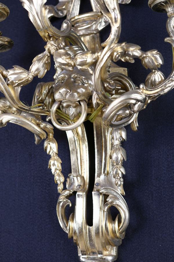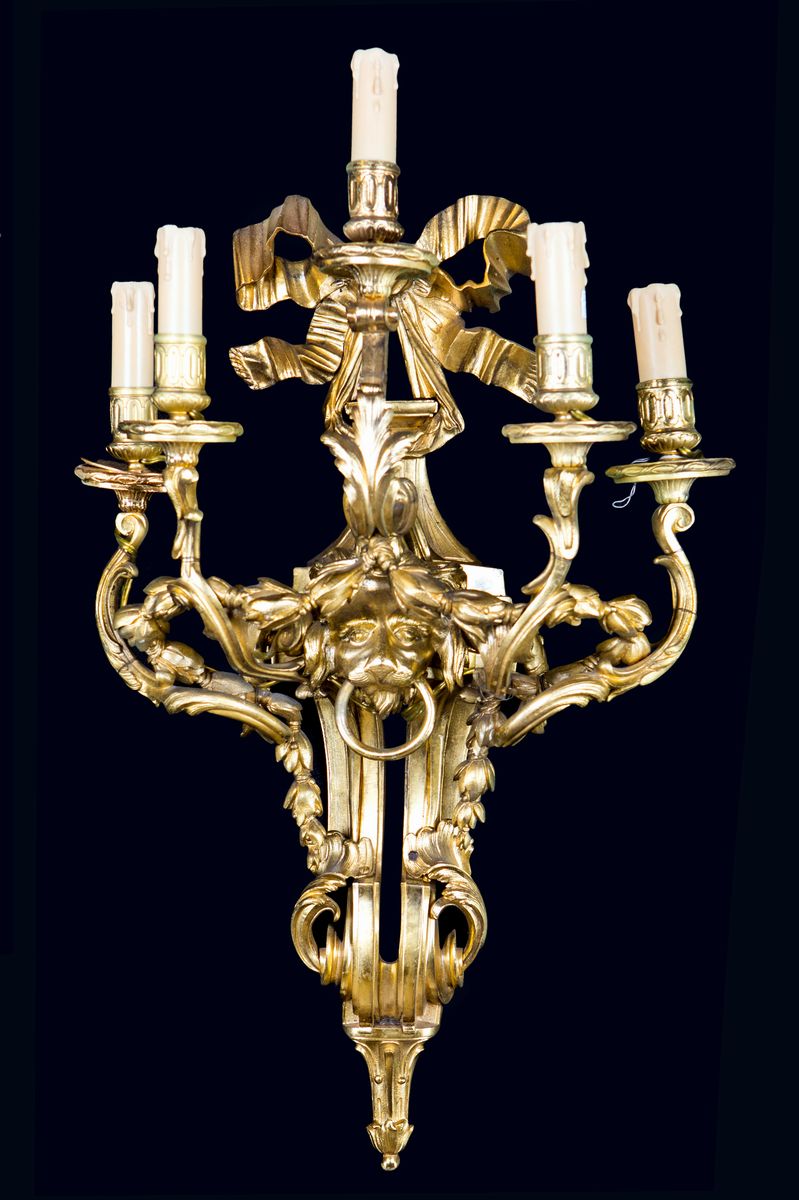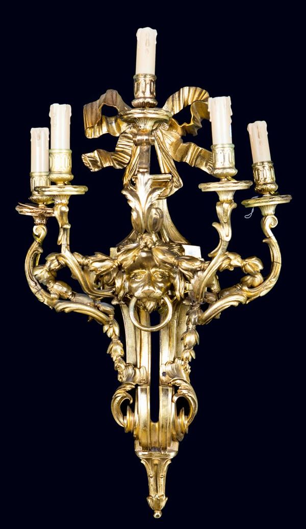 a cinque luci, con bracci sagomati arricchiti da rilievi vegetali e festoni; parte centrale caratterizzata da protome leonina con anello e supporto parietale sorretto idealmente da un fiocco