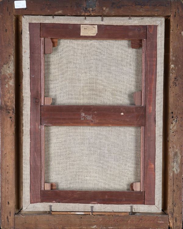 Reca iscrizione ad inchiostro al verso lungo il profilo superiore della cornice. Cornice Salvator Rosa in legno dorato a più ordini di intaglio