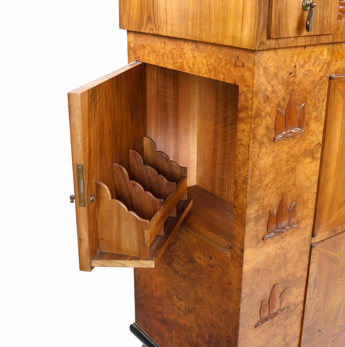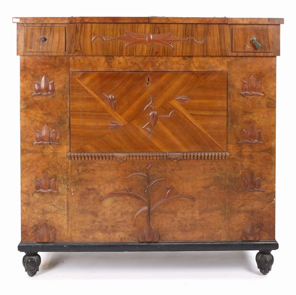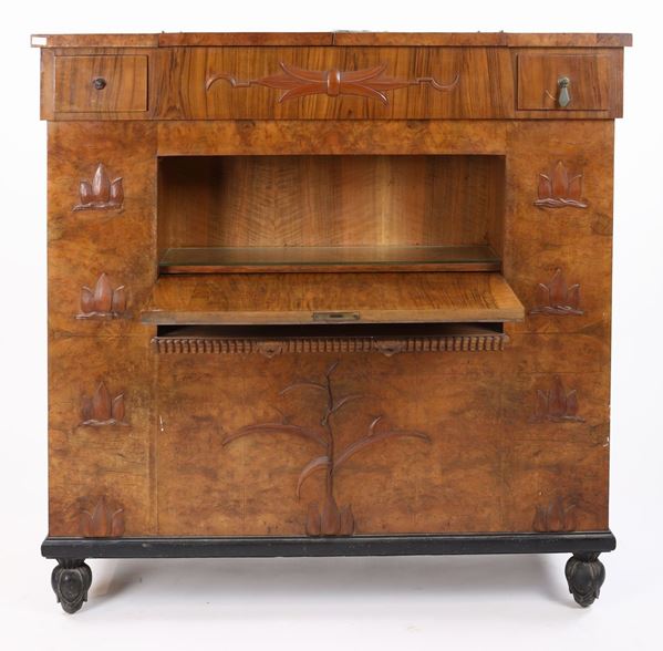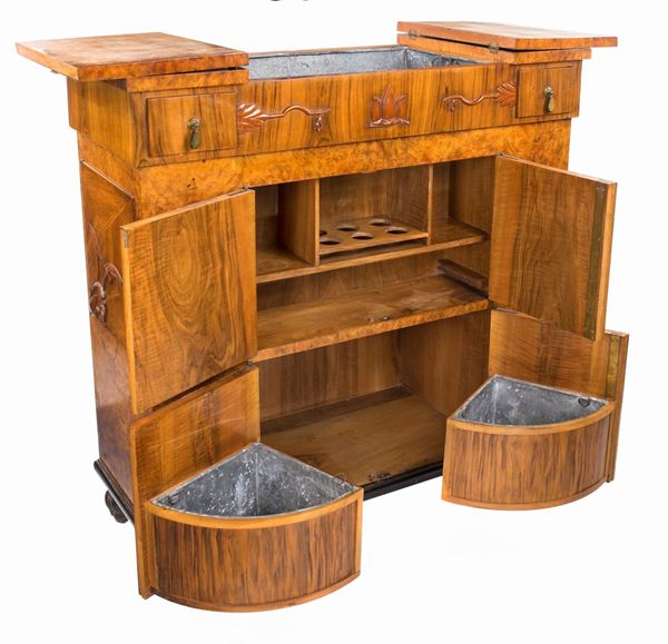 caratterizzato da rilievi ornamentali naturalistici; di forma squadrata, reca piano superiore apribile a celare un ampio vano con vasca in metallo ed ante con divisori interni su entrambe le facciate; piedi a bulbo