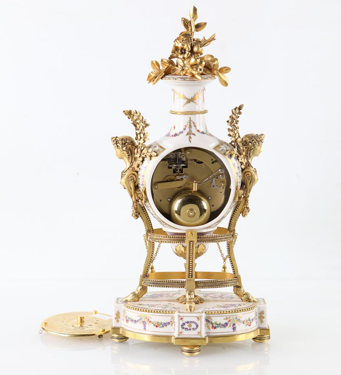Pendola in porcellana con ricca ornamentazione in bronzo dorato