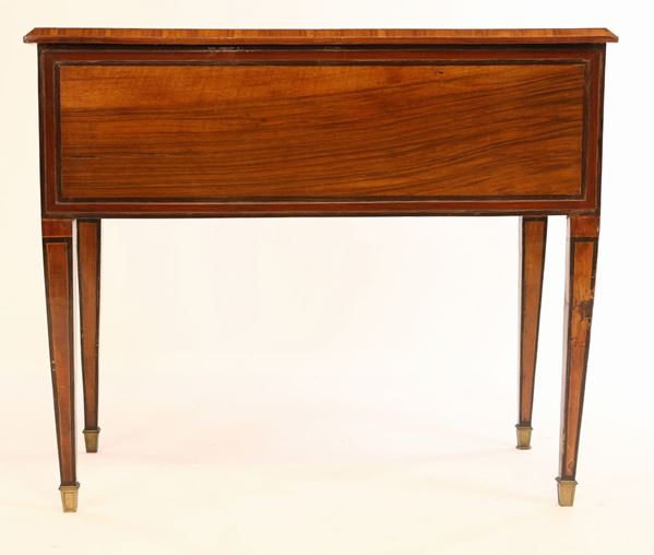 con filettature ed intarsi in legno di frutto, piano rettangolare rivestito in pelle, tre cassetti in linea e due sottostanti laterali, gambe rastremate con puntali in ottone dorato. Restauri e rifacimenti