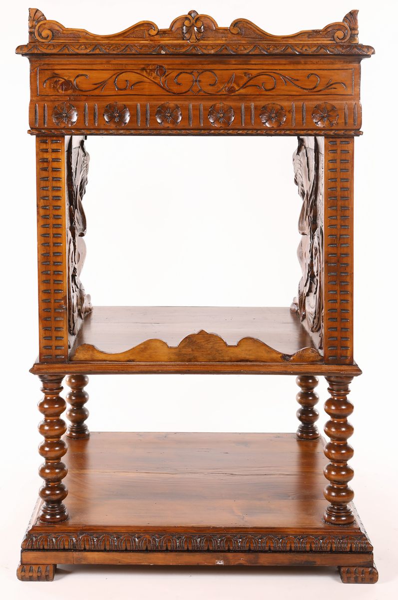 con caratteristiche ornamentali di gusto rinascimentale; piano inclinato incernierato rivestito in pelle e profili percorsi da mezze corolle intagliate, con due ampi vani a giorno delimitati da figure laterali di grifo e da colonne tornite