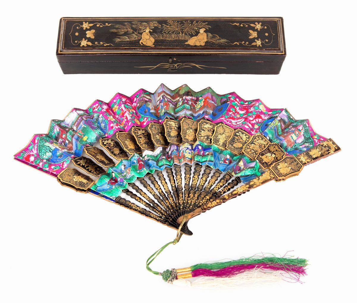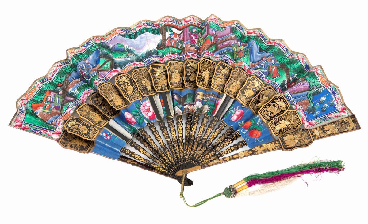 con stecche abbellite da miniature con figure di orientali e motivi naturalistici e due ordini di pagine in carta acquerellata decorata su ambedue i lati in vivace policromia a riserve con scene di genere animate da personaggi con volti minuziosamente resi su sottili scaglie di avorio. La scatola è similmente decorata in oro con figure e all'interno rivestita in seta arricchita da peonie dipinte. Lievi difetti all'interno della scatola