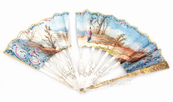con stecche traforate ed in parte dorate; pagina in carta acquerellata decorata su ambedue i lati da paesaggi con figure. Rotture e mancanze