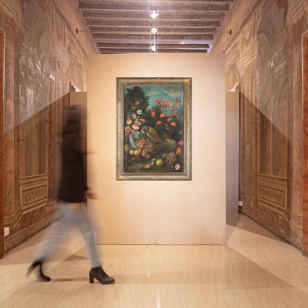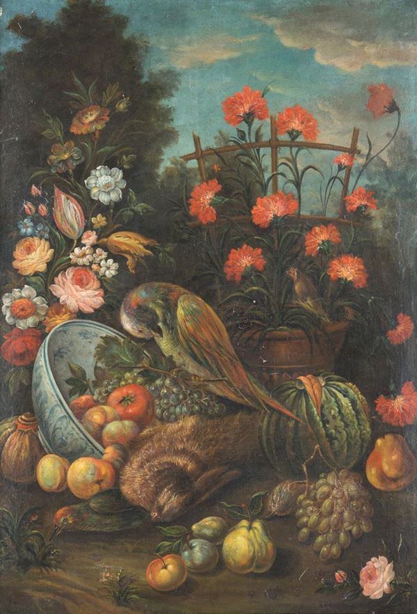 La felice invenzione compositiva con fiori, frutta, un volatile e una porcellana, e la cromia brillante, suggeriscono di riferire l'opera alla figura di Giacomo Nani, importante pittore di nature morte attivo a Napoli nella prima metà del XVIII secolo