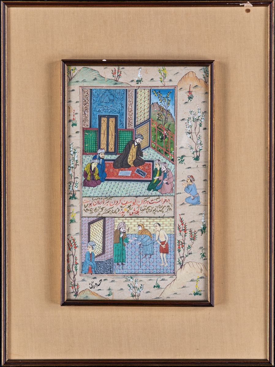 con doppia scena di genere separate da iscrizione; in cornice