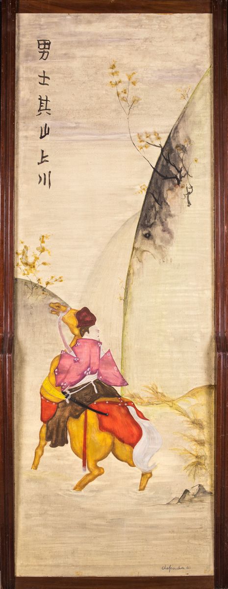 raffigurante un guerriero a cavallo; ideogrammi in alto a sinistra, firma non decifrabile e data '61 in basso a destra