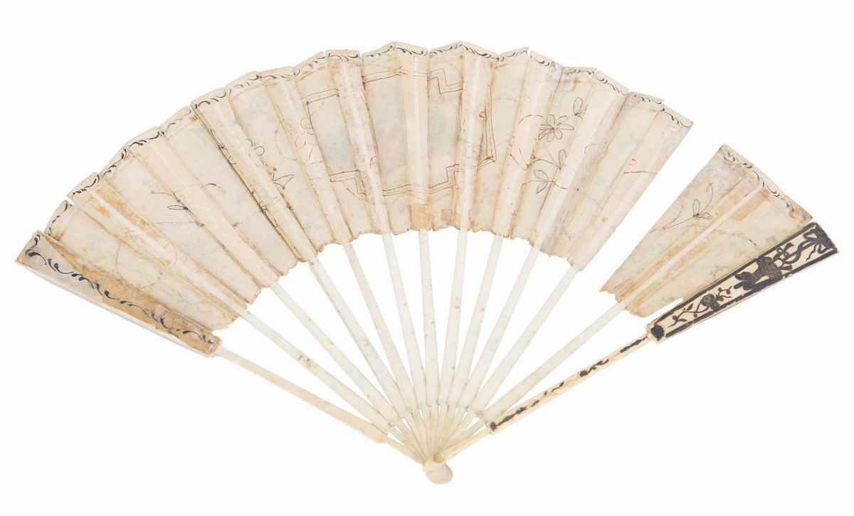 con stecche in avorio arricchite da tralci dorati; pagina in carta doppiata in seta, decorata all'acquerello da una scena galante entro riserva circondata da tralci fioriti impreziositi da paillettes ricamate e figure di insetto minuziosamente rese. Rotture e mancanze