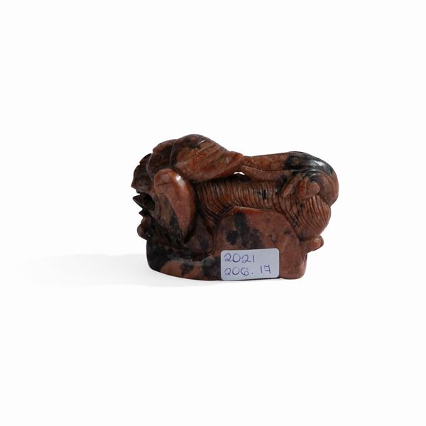 Cane di Pho in pietra dura rossa e nera, Cina, XX secolo