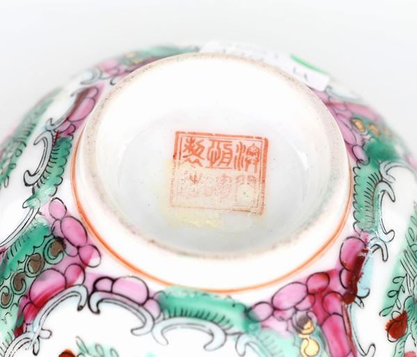decorata esternamente ed internamente a motivi naturalistici in verde e rosa entro nicchie definite da cartigli. Marca in rosso a sei caratteri