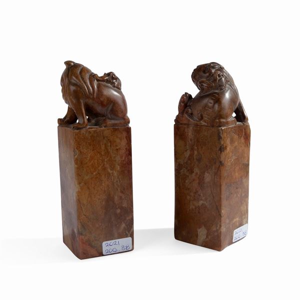 Coppia di sigilli in pietra saponaria con leoni buddisti, Cina, XX secolo