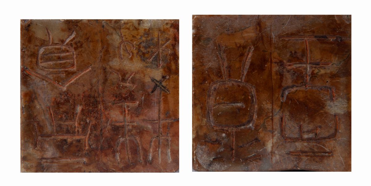 con iscrizioni incise sui lati e ideogrammi sotto la base